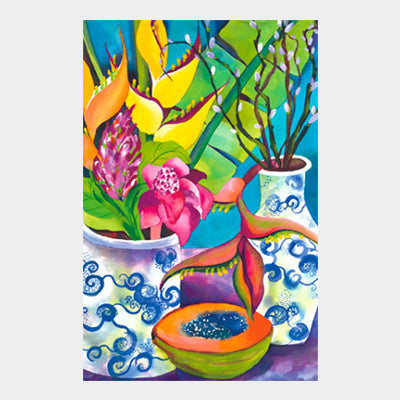 This tropical still life combines a mixture of some of my favorite floral /fruit subjects and, Blue and White ceramic vases. I started this painting in a workshop taught by Rita Argen Auerbach. She is a wonderful artist and teacher with lots of energy and enthusiasm for life. Each student contributed something to the still life set up which usually makes for a very interesting eclectic mix of painting subject.