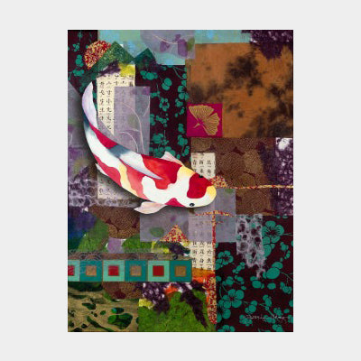 Flowing In Harmony is a mixed media collage that incorporates a collage Asian inspired background and a watercolor koi placed on top. This is a triptych (3 part) image. I have always admired the smooth flowing movement of the koi fish as they glide through the water. Their presence creates a sense of calm in life. Arranging the water colored koi on the artwork to communicate movement was the most challenging but fun part of the work. Image B is a single koi representing solitude, the self and who we are.
