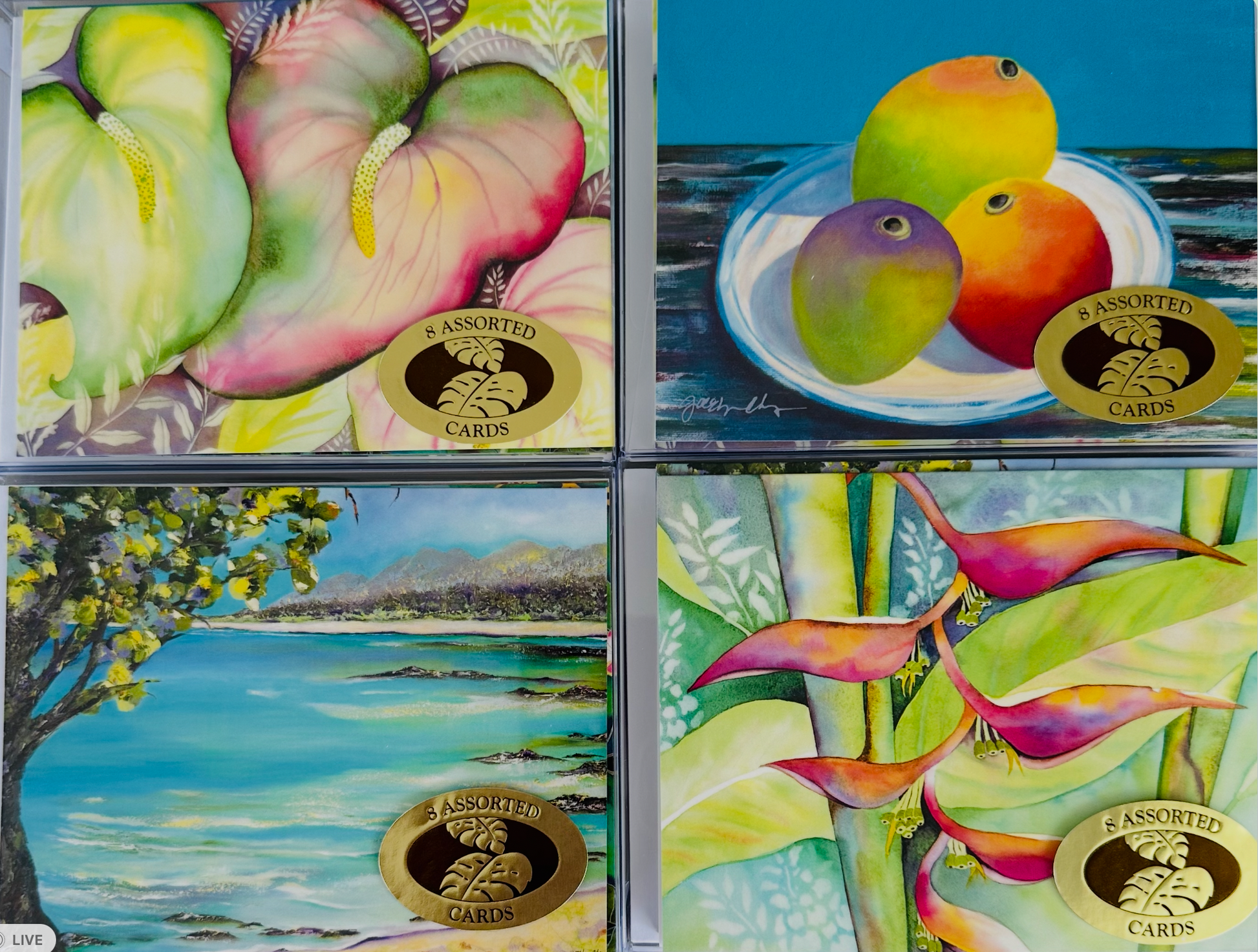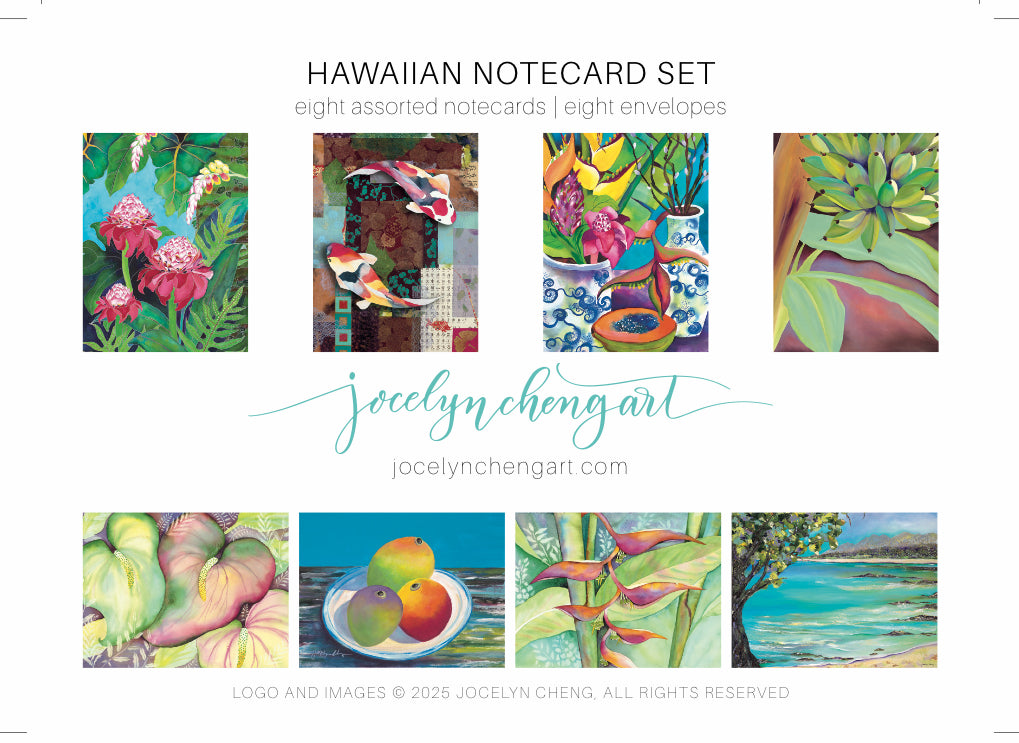Each set of 8 Assorted notecards and envelopes are packaged in a clear acrylic box. The cards measure 4 -1/4” x 5-1/2”. The Hawaiian assortment of notecards include four island floral images, two fruit, one landscape and a mixed media Koi image. I hope you enjoy this new notecard assortment.