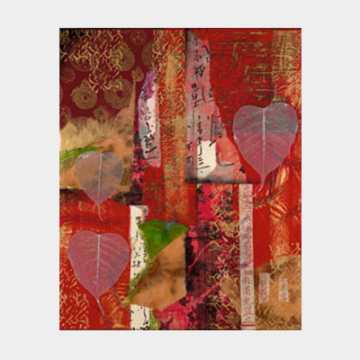 Peace and Harmony is a mixed media collage that was created at the beginning of the New Year in 2010. I wanted to use a red color scheme symbolic of Chinese New Year. There are different red washi and rice papers along with Bode leaf skeletons woven together with calligraphy papers. I used the bode leaf symbolically as a connection to Buddah and his journey towards Enlightenment, Peace, and Harmony. The images can be purchased individually or as a set.