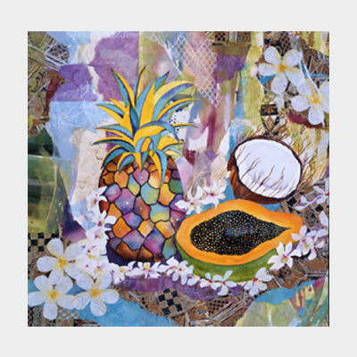 Pineapple Party is a mixed media where I used collage and watercolor together to create the textures seen here. I put the lei around the pineapple since it was a party celebrating the pineapple and it's long history in Hawaii's past.