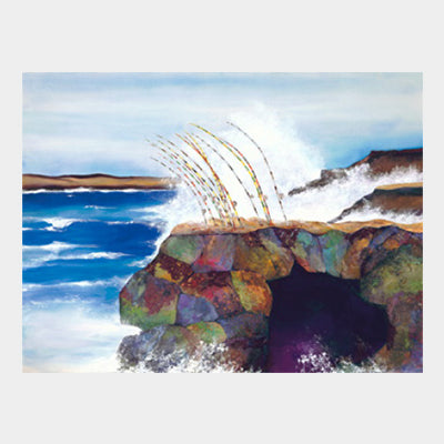 The South Point on the Big Island of Hawaii is the southern-most point in the United States. Among Hawaii fisherman it is a favorite fishing location. It is believed that the first Polynesians landed here 1,200 years ago. In the area, there is a series of buried lava flows and vegetation is sparse due to the constant force of trade winds. This painting was done for a very good friend of mine who camped on a remote area of South Point, Big Island. Setting up a" bamboo ridge" of fishing poles, they fished for a weekend. This painting acheives a unique look due to the use of the mixed media of watercolor and collage.
